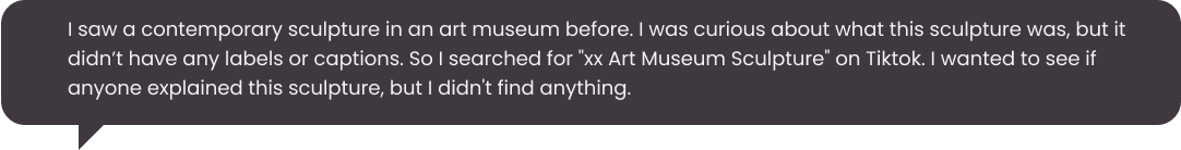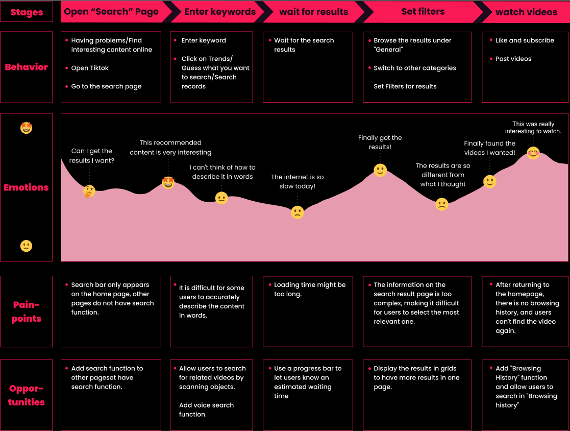 I interviewed 5 Tiktok users with different age groups and interests. The purpose of these interviews is to understand the process of using the "search" function of Tiktok and to identify pain points and opportunities based on their experiences. Additionally, in order to fully understand the overall experience of the "search" function, I interviewed two Tiktokers and got insights from them about what they care about most when searching on Tiktok.