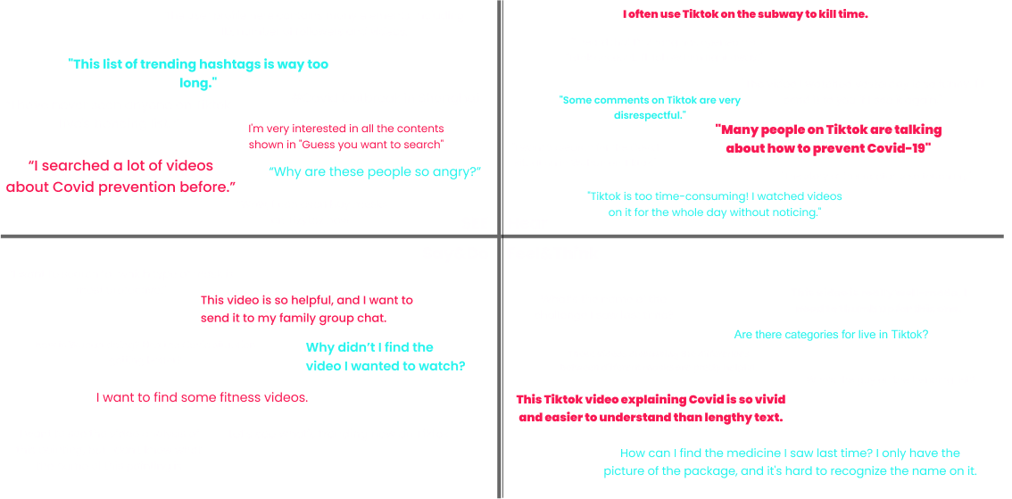 I struggled a lot during the research phase trying to come up with a specific user group for this design challenge. However, the user base of Tiktok China is too large that I can't include all types of users in my research process. So I started this project by broadly looking online, and I found a lot of concrete research conducted for Tiktok, which was crucial for this project. I learned how powerful the internet could be when designing for a large demographic product.