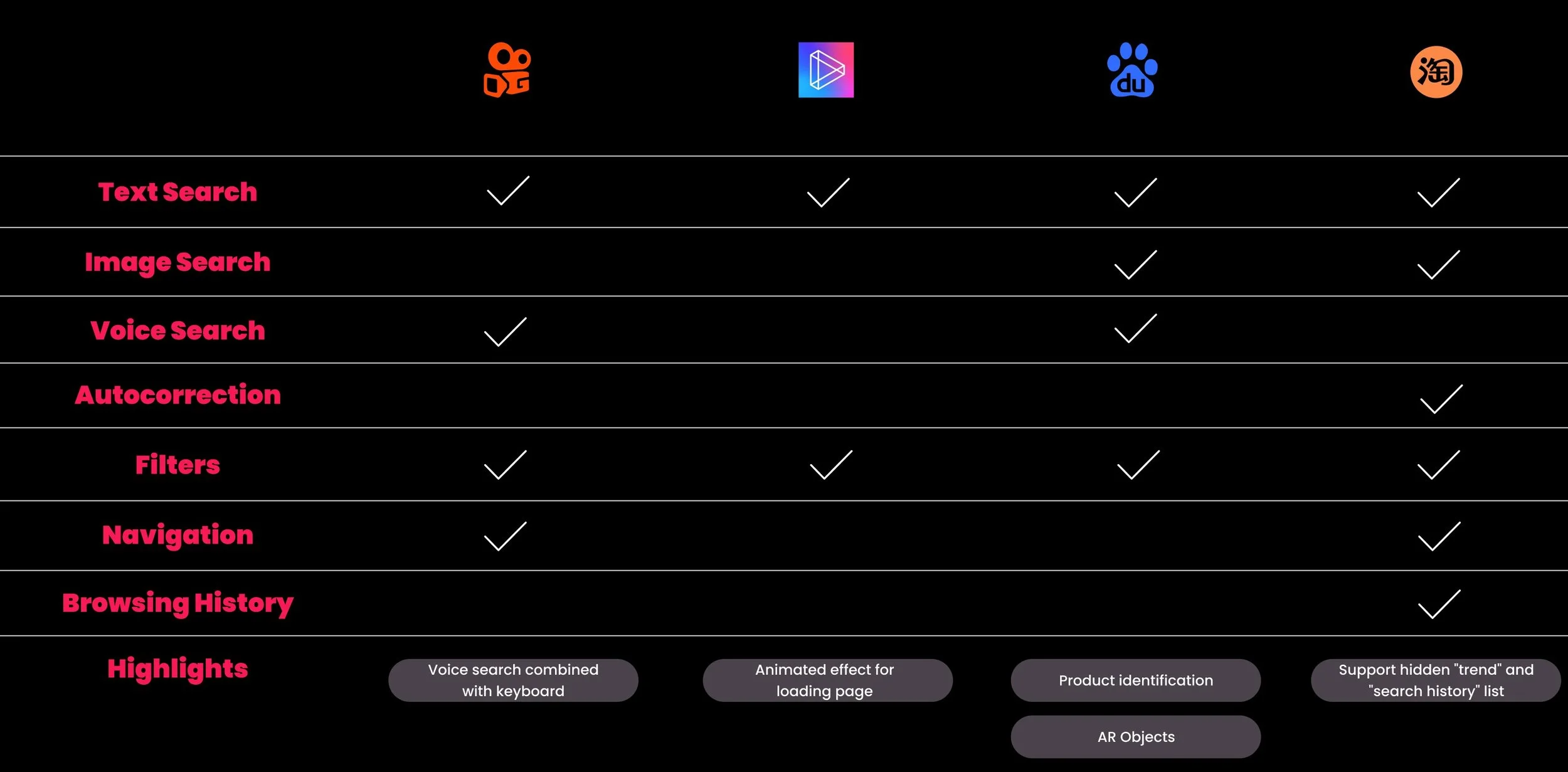 To understand what other platforms are designing their search functions to improve the matching rate of search results, I compared and analyzed four direct and indirect competitors. The search function is widely used by many apps, so there were a lot of resources I could learn from - from direct competitors to search engines.